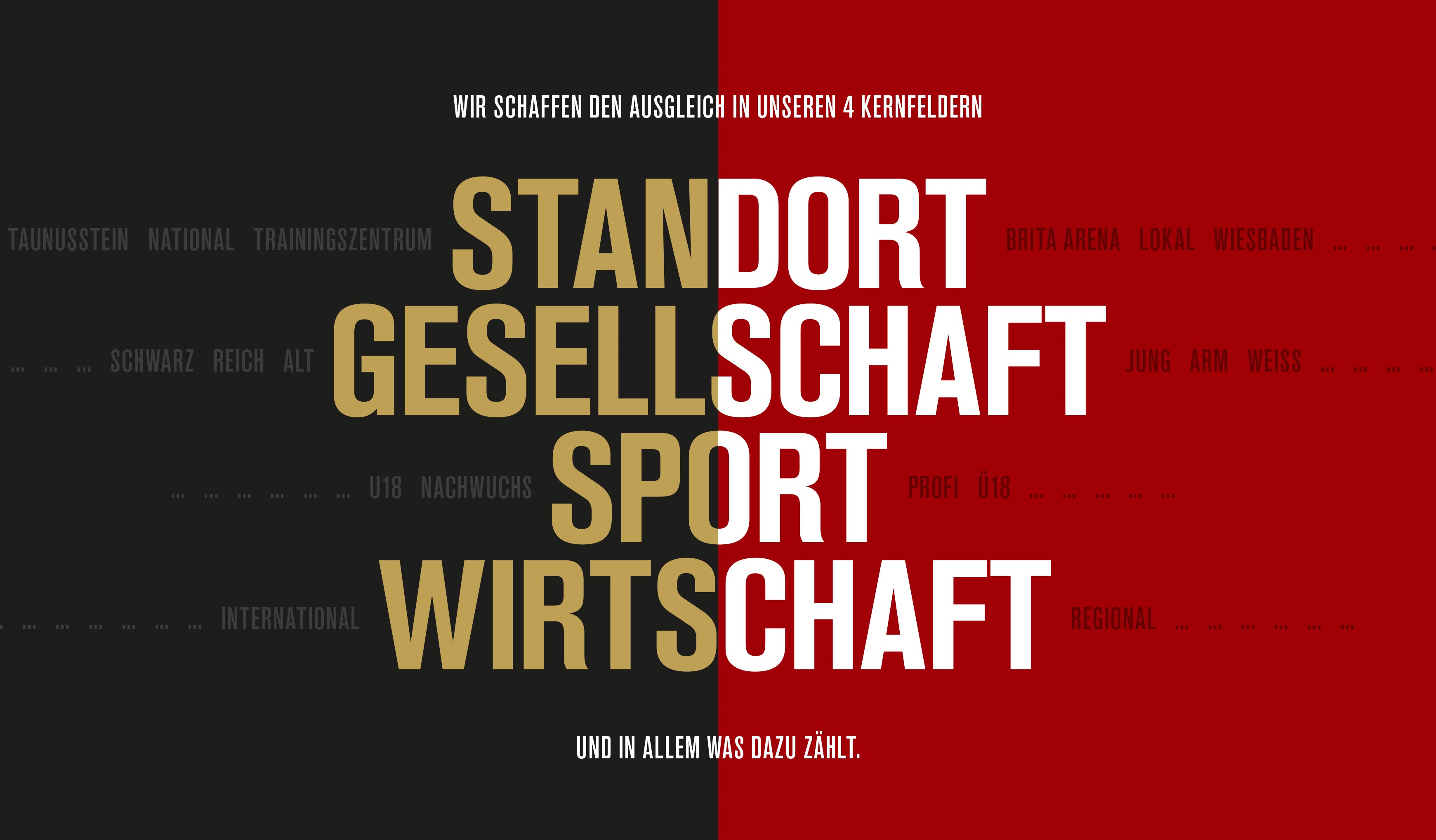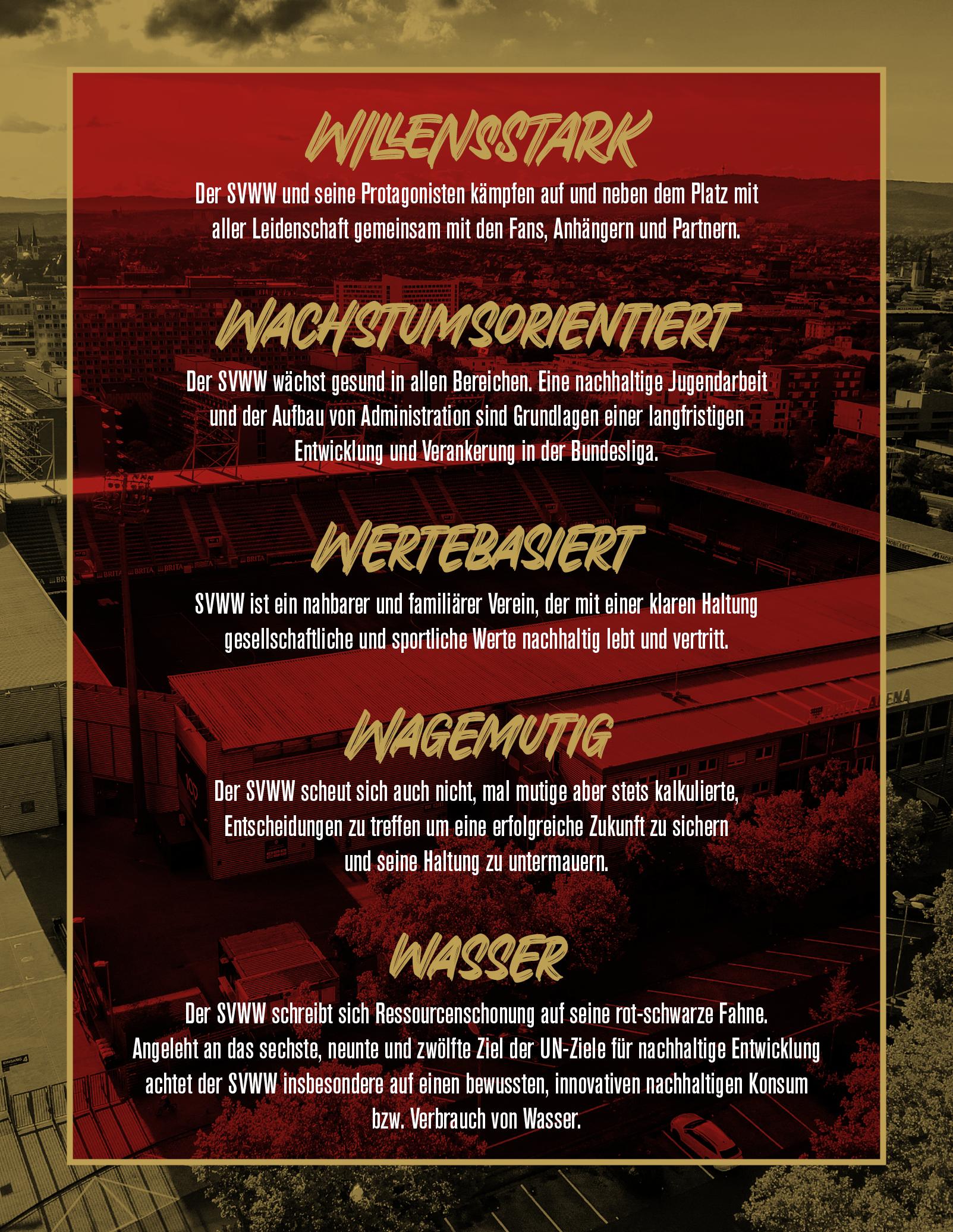 Auch in Zukunft wollen wir uns auf und neben dem Platz stetig weiterentwickeln. Weil wir uns unserer gesellschaftlichen, ökologischen und ökonomischen Verantwortung bewusst sind, denken wir langfristig und handeln effektiv. Wir nutzen unsere Nahbarkeit und die Strahlkraft des Fußballs, um alle Anspruchsgruppen rund um den SVWW zu ganzheitlichem Denken und nachhaltigem Handeln zu sensibilisieren und zu inspirieren. Wir streben kontinuierlich einen nachhaltigen Ausgleich zwischen Gegensätzen in einer schnelllebigen, anonymisierten Zeit an: Über, mit und im Fußball. Als SVWW vereinen wir nicht nur Taunusstein und Wiesbaden, Alt und Jung, sondern auch Business mit Humanität und Wachstum mit Nachhaltigkeit. Dabei konzentrieren wir uns auf die vier Kernfelder Standort, Gesellschaft, Sport und Wirtschaft.