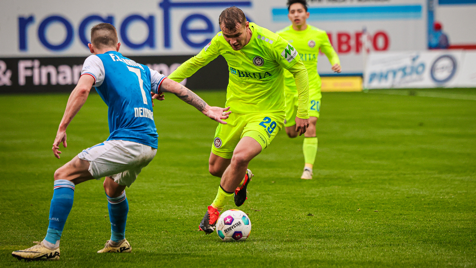 Im strömenden Regen des Ostseestadions waren bereits mehr als 25 Minuten gespielt, als der Torjäger der Rot-Schwarzen Ivan Prtajin Heimkeeper Markus Kolke mit einem ersten zentralen Torschuss aus halblinker Position prüfte (26.). Zuvor hatten sowohl der Kopfballversuch von Hansa-Innenverteidiger Damian Roßbach (12.) als auch ein Distanzschuss von Lasse Günther auf der Gegenseite (14.) ihr Ziel noch verfehlt. Nach mehr als einer halben Stunde hatte dann der von Robin Heußer per Doppelpass stark in Szene gesetzte Nick Bätzner frei vor Kolke die bis dato beste Chance des Spiels, brachte den Ball jedoch unter Gegnerdruck und den schwierigen Platzverhältnissen geschuldet nicht auf den weiß-blauen Kasten (34.). Bereits in der Nachspielzeit zwang dafür ein direkt geschossener Freistoß von Heußer Kolke zu einer ersten Flugparade (45.+1) und auch den Kopfball des rot-schwarzen Abwehrhünen Aleksandar Vukotic nach dem anschließenden Eckball hielt der Rostocker Schlussmann aus kurzer Distanz fest (45.+2).