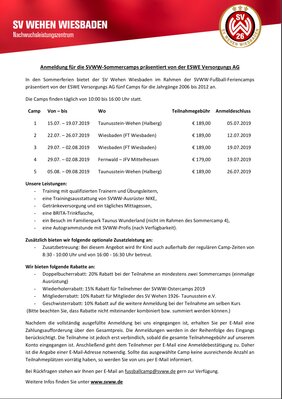 Du möchtest in den Ferien trainieren wie ein Profi und hautnah beim SV Wehen Wiesbaden dabei sein? Dann bist Du bei den „SVWW-Fußball-Feriencamps“ präsentiert von der ESWE Versorgungs AG genau richtig.