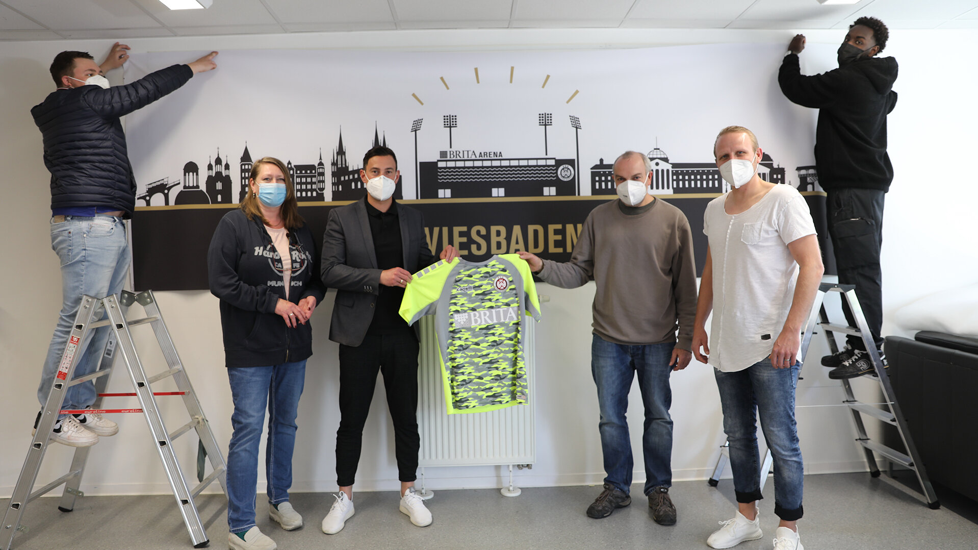 In einer partnerschaftlichen Aktion der Clubwerkstatt und der BRITA-Arena haben angehende Raumausstatter dem Bereich der Mixed-Zone im Stadion zu einer neuen Optik verholfen, in dem jetzt zwei große Wandverspannungen mit den Wahrzeichen von Wehen und Wiesbadens den Eingangsbereich zieren.