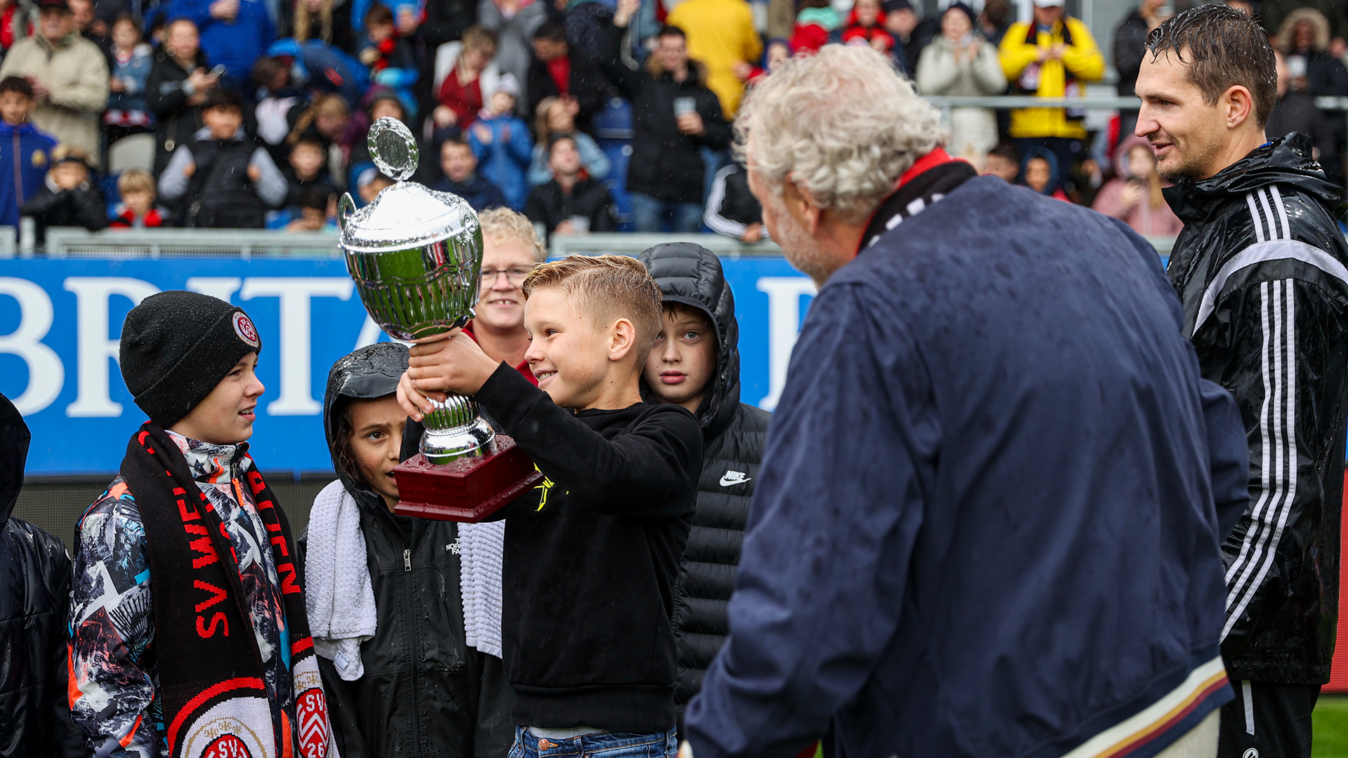 Bei der von SVWW-Legende Alf Mintzel moderierten Siegerehrung unmittelbar vor Anpfiff der Zweitliga-Partie überreichten SVWW-Vizepräsident Jürgen Fladung und Kai Schröer von Backhaus Schröer den Siegern ihren Pokal.