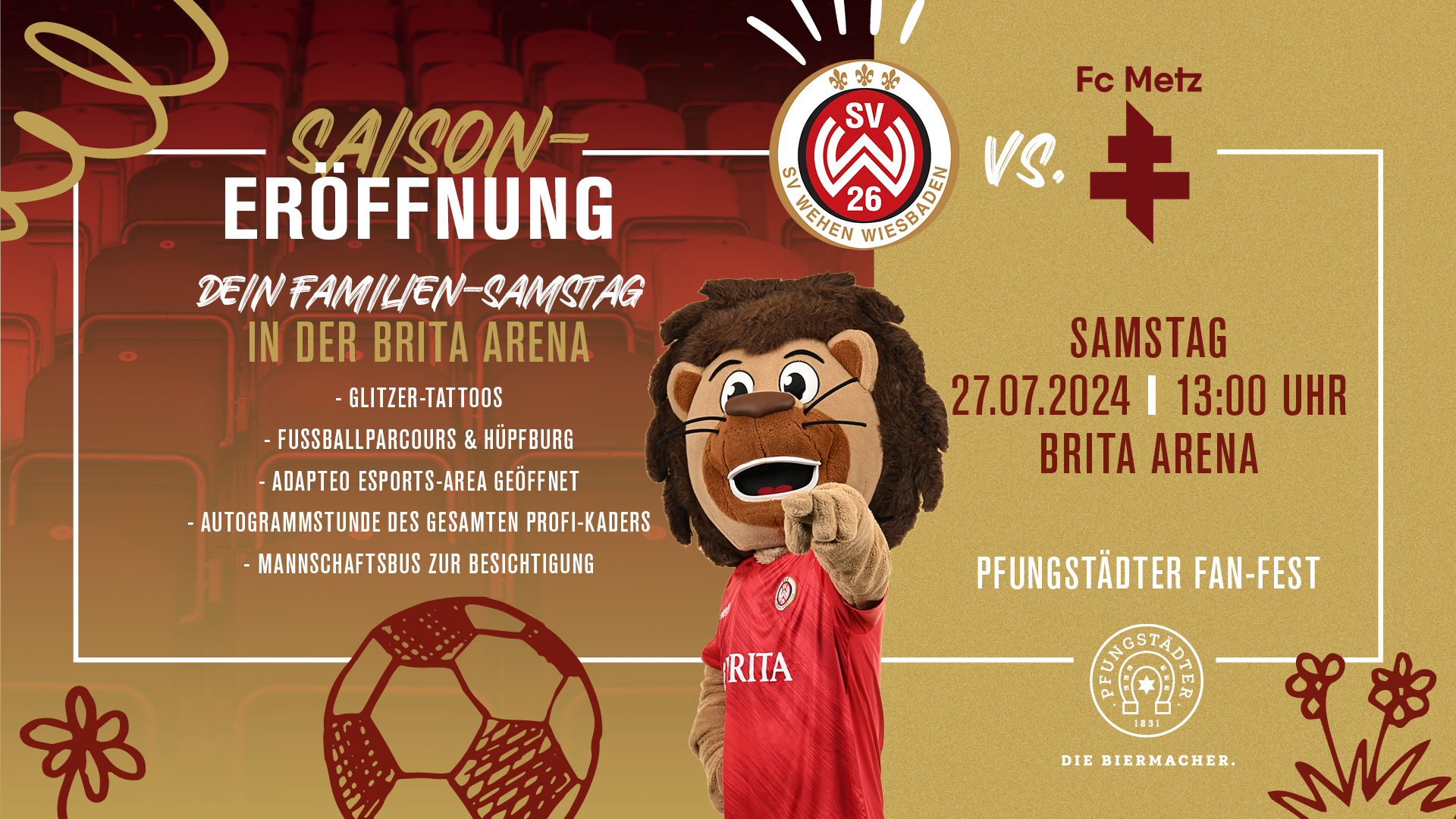 Bereits ab 11 Uhr wartet auf alle Fans ein buntes Rahmenprogramm für die ganze Familie. So wird es eine Fußballstation, eine Hüpfburg vom Taunus Wunderland sowie einen Stand mit Glitzer-Tattoos geben. Zudem ist auch die Adapteo eSports-Area geöffnet, in der die Besucher im Fußballsimulationsspiel EA FC gegeneinander antreten können. Abgerundet wird die Saisoneröffnung nach dem Spiel mit einer großen Autogrammstunde des Profi-Kaders.