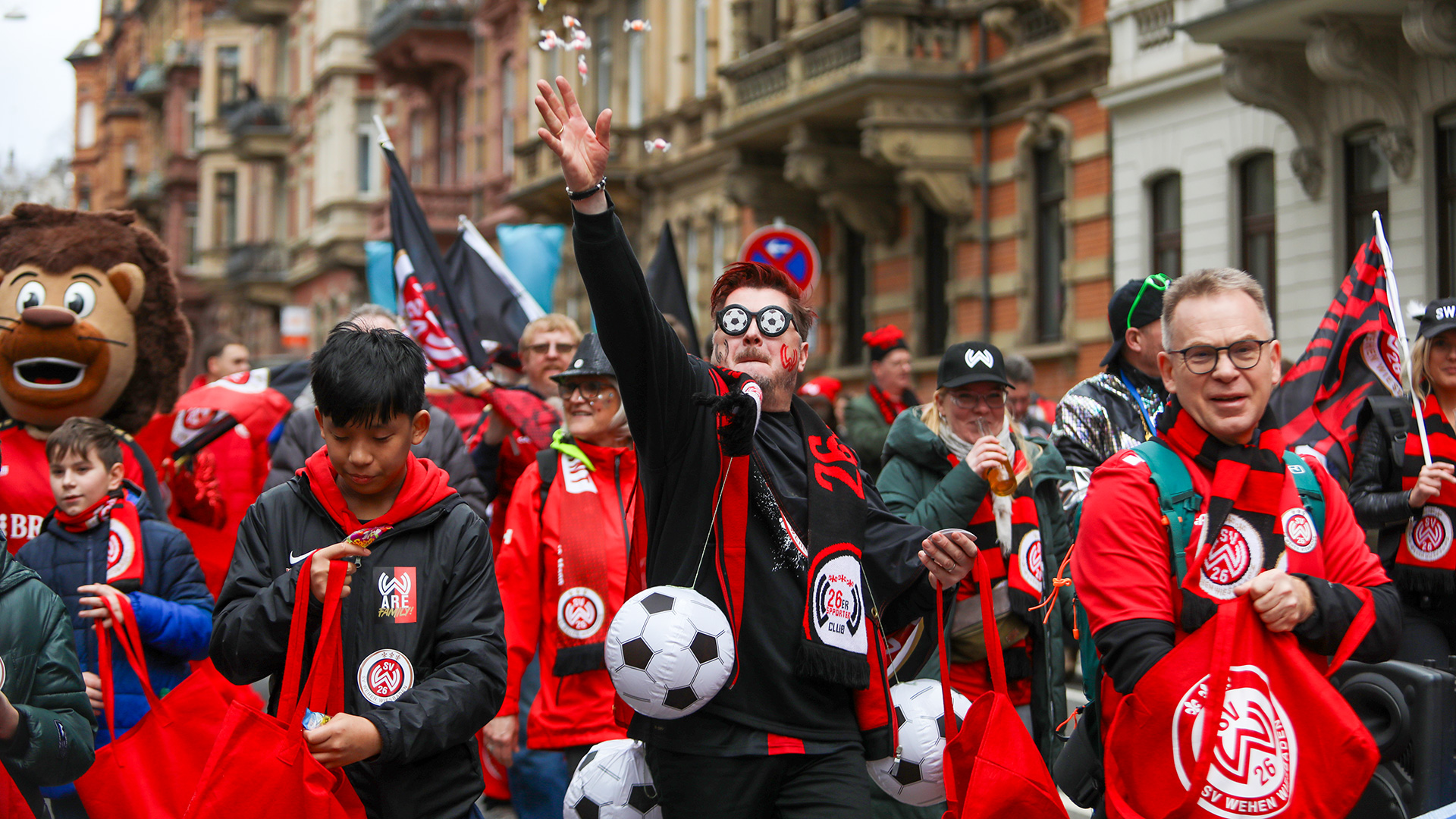 Unter die rot-schwarzen Narren mischten sich mit Profi-Schlussmann Noah Brdar, Maurice Schulz und Pascal Srougbo auch drei NLZ-Talente des SVWW. Diese verteilten neben den fastnachtstypischen Kamellen auch um die 200 Promotioncodes für das kommende Zweitliga-Heimspiel des SVWW gegen den SC Paderborn in der BRITA Arena am Freitag (23. Februar, 18:30 Uhr).