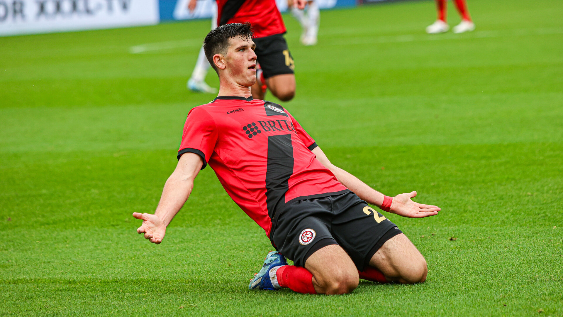 Nach einem weiten Einwurf von Thijmen Goppel setzt SVWW-Stürmer Moritz Flotho mit seinem Versuch per Fallrückzieher das erste artistische Highlight der Partie. Nur drei Zeigerumdrehungen später behauptet der groß gewachsene Angreifer einen langen Ball und setzt anschließend Nick Bätzner in Szene, dessen Abschluss jedoch geblockt wird.