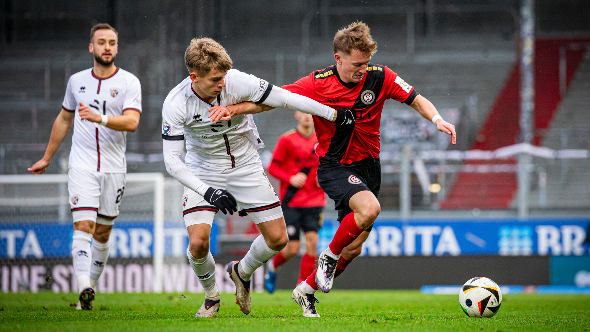 Riesenchance auf den 2:3-Anschlusstreffer! Nach einer Flanke von Goppel nimmt Moritz Flotho den Ball stark mit der Brust an, dreht sich um seinen Gegenspieler und feuert die Kugel aus rund fünf Metern Torentfernung knapp über die Latte.