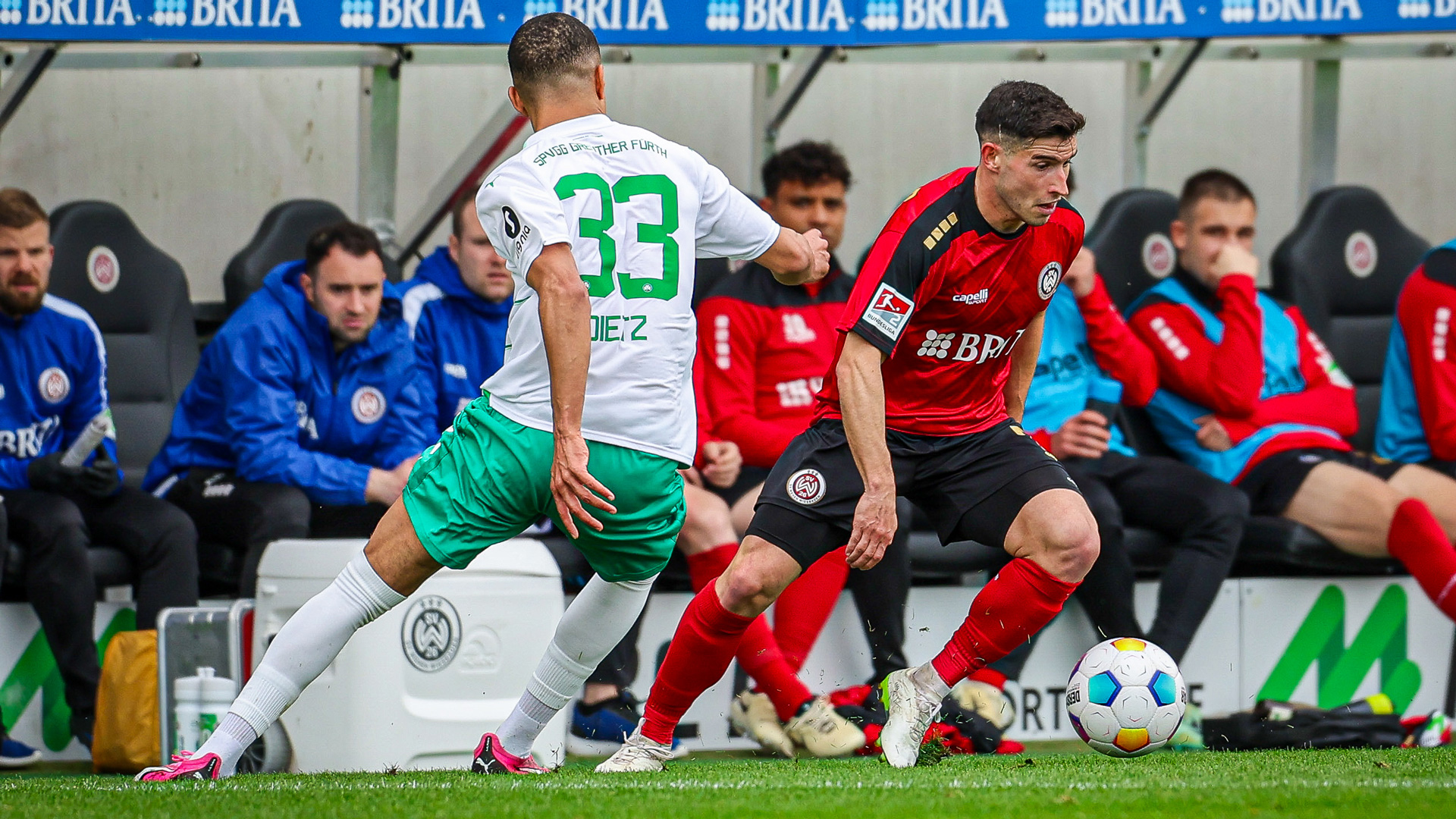 In der BRITA Arena waren noch keine drei Minuten gespielt als Top-Torjäger Ivan Prtajin mit dem 1:0 für den rot-schwarzen Traumstart sorgte. Von John Iredale in Szene gesetzt schloss der SVWW-Stümer an der Strafraumkante aus halbrechter Position ab und traf mit seinem wuchtigen Flachschuss zielgenau ins lange Eck (3.). Eine Viertelstunde später machte dann Nikolas Agrafitios mit seinem Premierentreffer in der 2. Bundesliga das frühe 2:0 für die Gastgeber perfekt. Im Spielaufbau der Fürther fing er den Pass von Gästekeeper Jonas Urbig ab und vollstreckte frei vor dem Tor sicher ins rechte Eck (18.). Auf der Gegenseite sorgte Kleeblatt-Angreifer Branimir Hrgota jedoch für den schnellen Anschlusstreffer. Zwar scheiterte der Schwede im ersten Versuch noch am stark parierenden Florian Stritzel, nutzt dafür aber nur Sekunden später seine zweite Chance nach einer Flanke von der linken Seite (26.). Durch einen Doppelpack von Armindo Sieb (38., 43.) drehten die Franken das Spiel im Anschluss noch vor dem Halbzeitpfiff in ihre Richtung. In der Nachspielzeit ergab sich dem SVWW zwar nochmal die Chance zum Ausgleich, doch SGF-Rechtsverteidiger Simon Asta blockte den gefährlichen Abschluss von Martin Angha nach einem Eckball (45.+3).