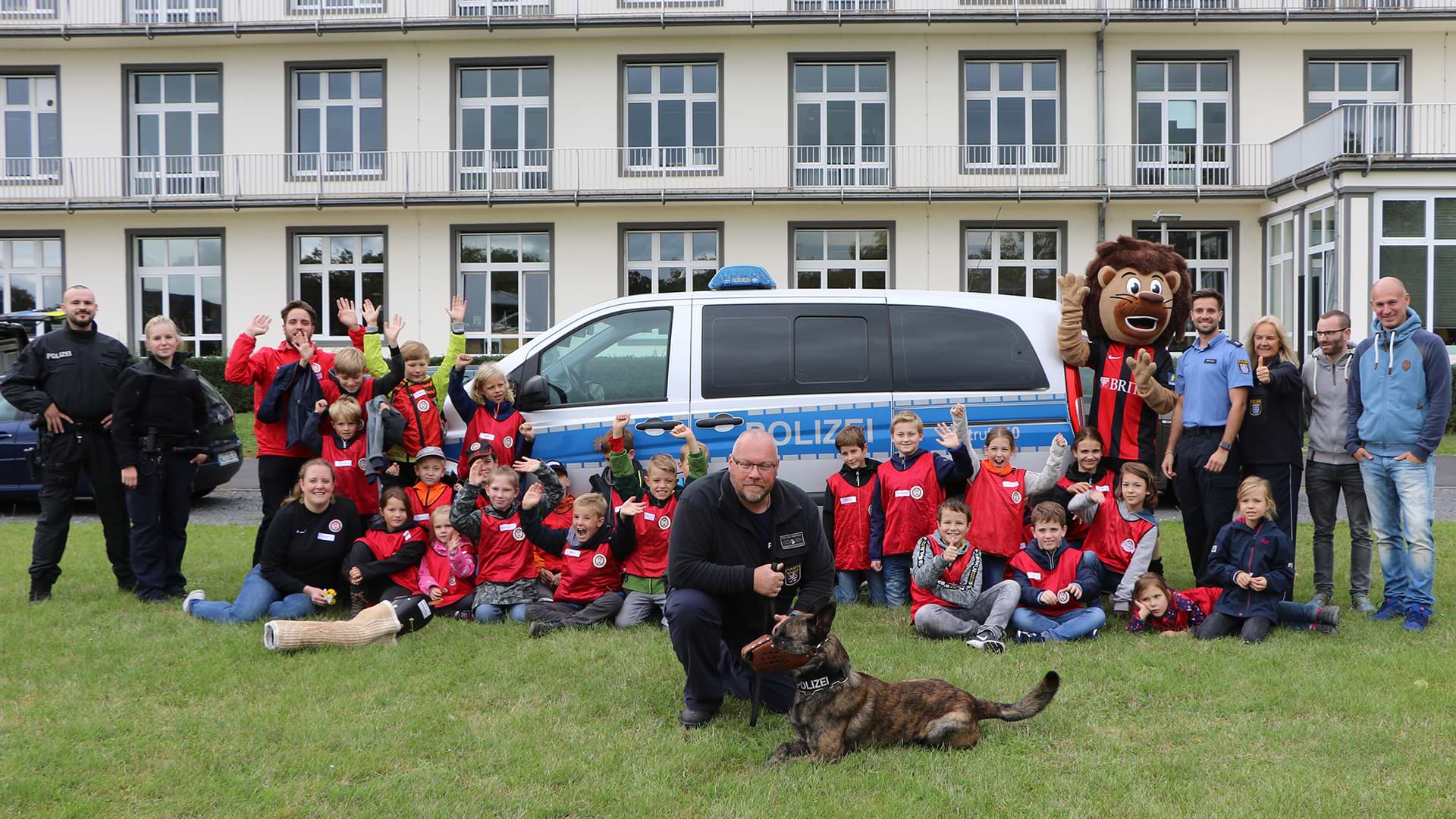 So wurden die Kids im Polizeipräsidium Westhessen an der Konrad-Adenauer-Straße von den beiden szenekundigen Beamten der Rot-Schwarzen empfangen. An verschiedenen Stationen erwartete die 25 Mädchen und Jungen ein abwechslungsreiches Programm, angefangen mit einer Fotobox, in der die Kinder die Bekleidung der Polizei samt schusssicherer Weste anprobieren und ihren Freunden Handschellen anlegen durften. Danach gab es eine kleine Führung durch die Gefangenenzellen und Verhörraume direkt unter der Schaltzentrale der Polizei, ehe die Kids sogar in die schweren Monturen einer Schutzkleidung schlüpften und ein kleines Wettrennen veranstalteten. Natürlich durfte auch die Vorführung von Blaulicht und Sirenen in einem echten Polizei-Einsatzwagen nicht fehlen.