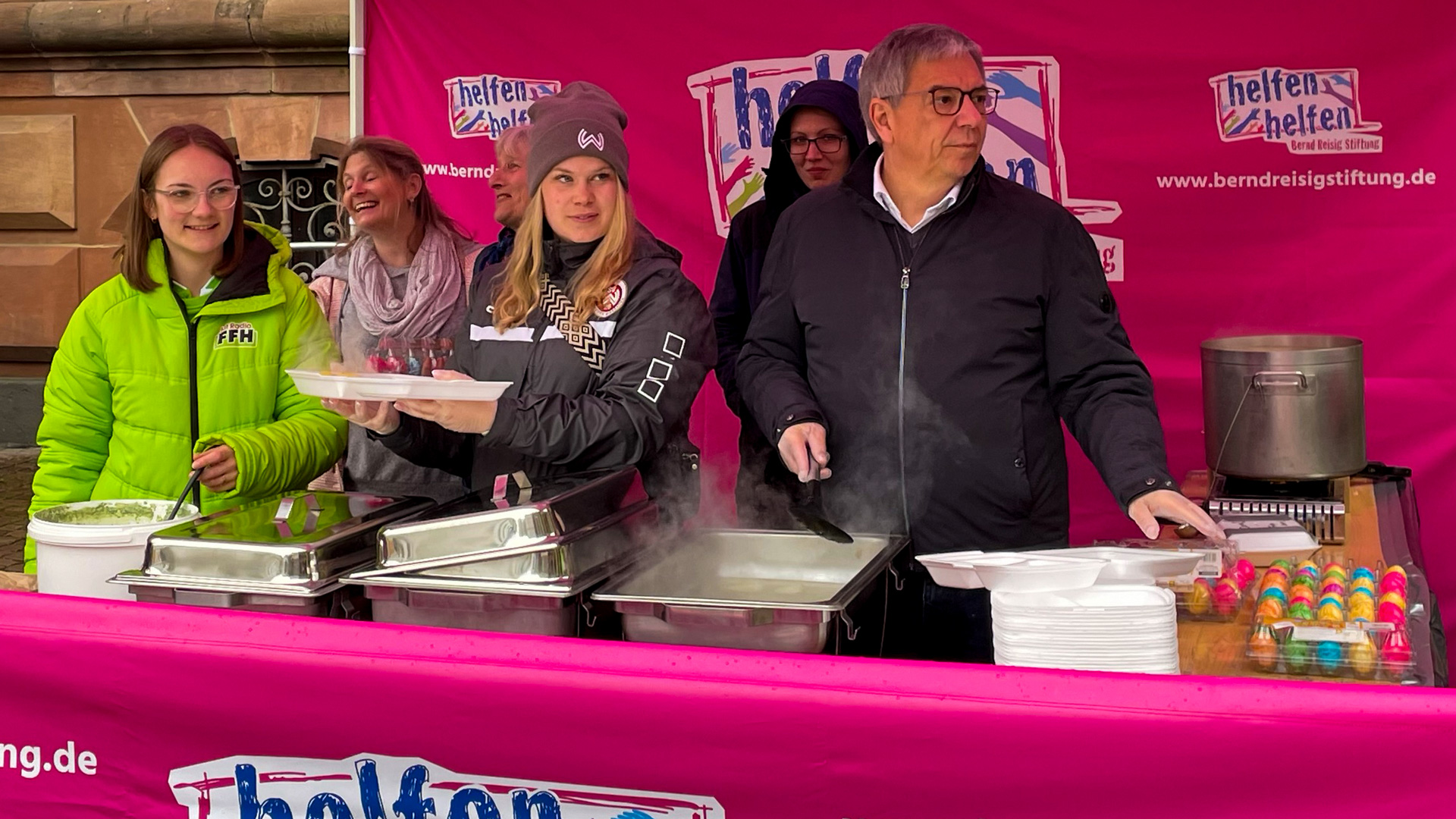 Der SV Wehen Wiesbaden hat am Karfreitag die von der Bernd-Reisig-Stiftung organisierte Aktion „Oster-Essen für Obdachlose“ unterstützt. Dabei erhielten Obdachlose und bedürftige Menschen auf dem Wiesbadener Rathausplatz neben einer Portion Frankfurter Grüner Soße mit Eiern und Kartoffeln zusätzlich noch eine kleine Geschenktüte mit einem Getränk, Obst und Brötchen. Bereits in den vergangenen drei Jahren hatten sich die Rot-Schwarzen als freiwillige Helferinnen und Helfer zur Unterstützung der mobilen Einsatzteams vor Ort an der Aktion beteiligt.